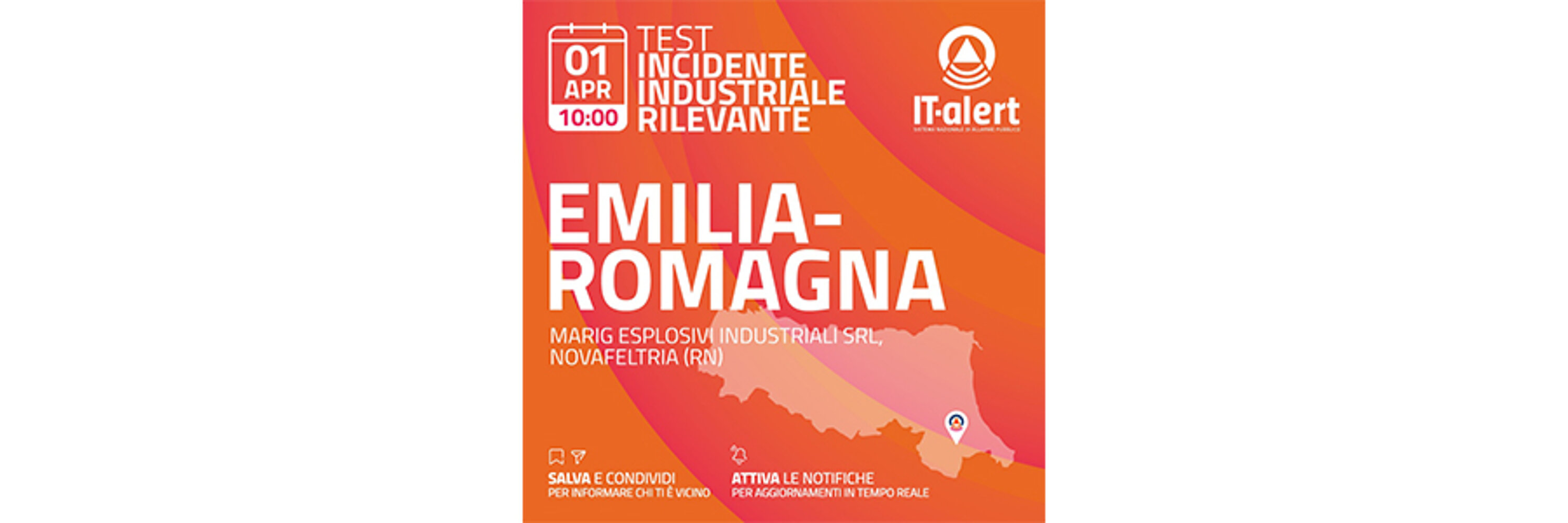 Il giorno martedì 1 aprile 2025 si svolgerà un TEST del sistema di allarme pubblico IT-Alert, del Dipartimento Nazionale della Protezione Civile, relativamente allo stabilimento soggetto alla direttiva “Seveso” azienda RIR (Rischio di incidente Rilevante) dell’azienda Marig Esplosivi industriali s.r.l. posta in Comune di Novafeltria (RN) località Celletta di Libiano.